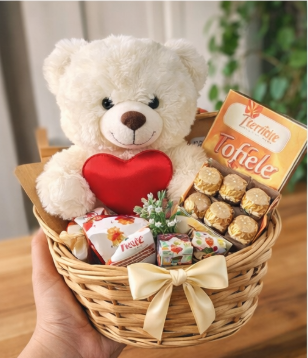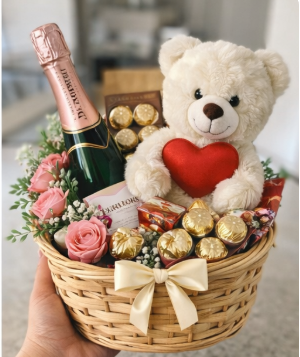 Cesta Romântica Ursinho, Rosas e Chocolates